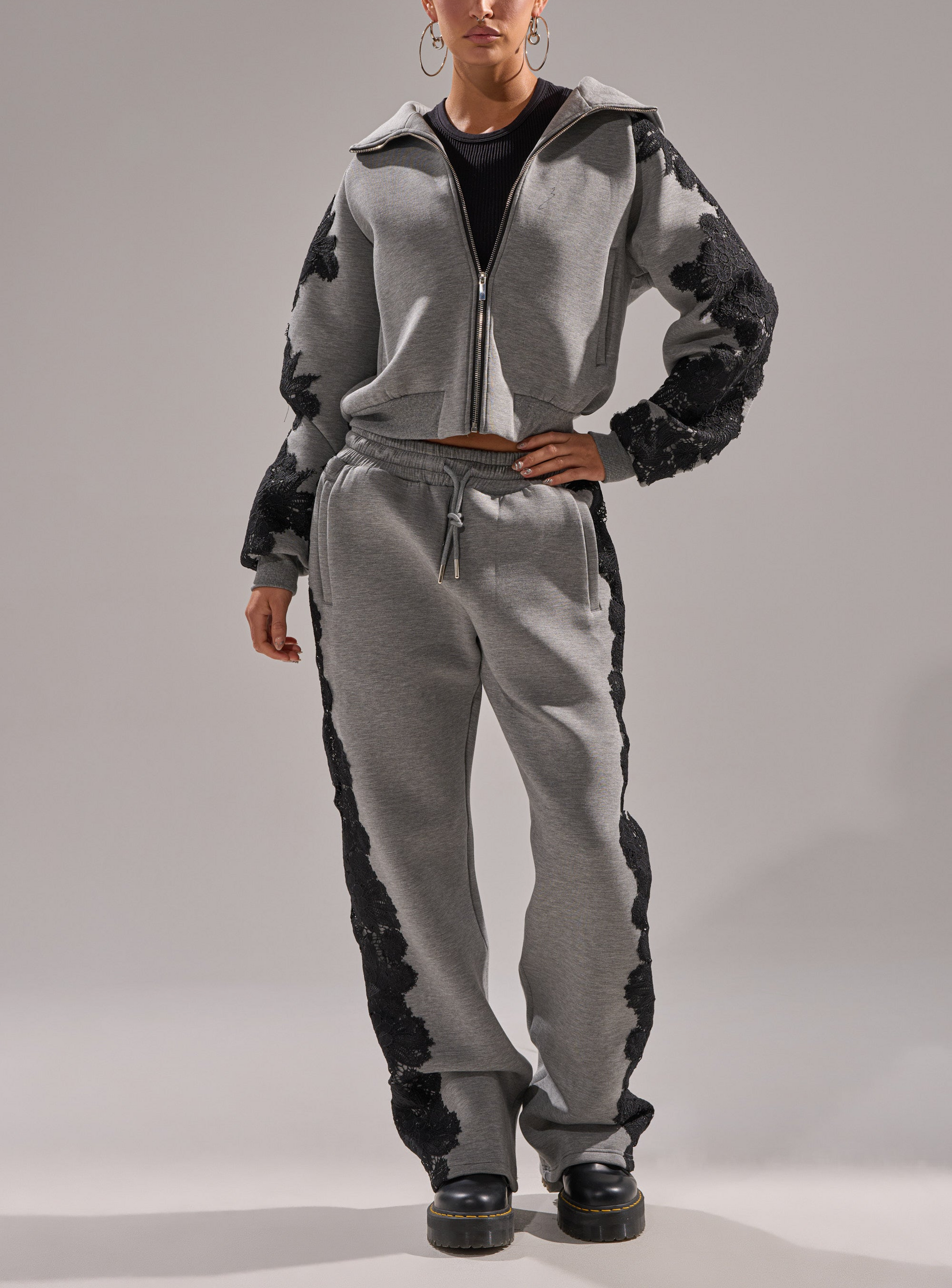 Black Lace Zip Up Hoodie Set
