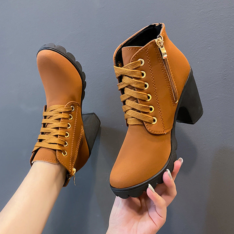 Step confidently into the season with the Elevated Lace-Up Ankle Boots, where bold design meets lasting comfort. Crafted for the modern woman who loves a refined yet powerful silhouette, combines a chunky heel, elegant lace-up structure, and a polished metal buckle to deliver a look that stands out effortlessly.