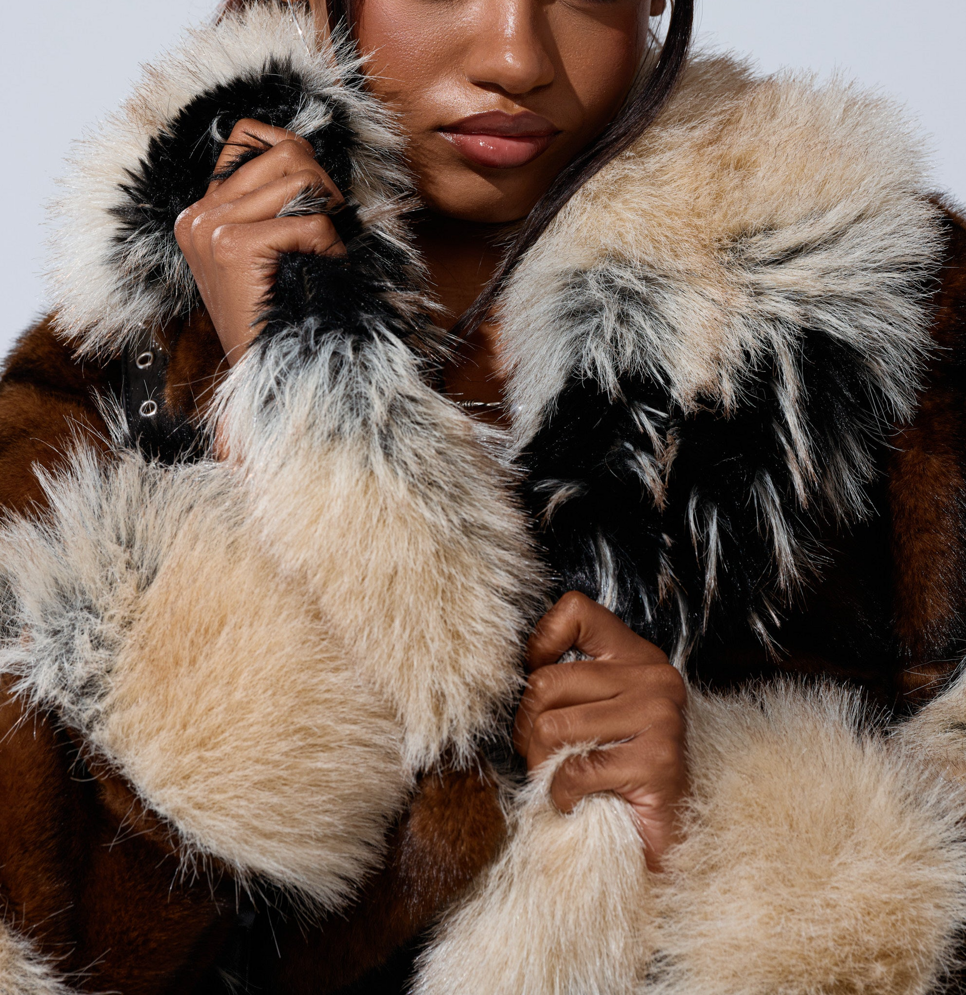 Fight off the chills in The Cropped Faux Fur Jacket. This lavish outerwear piece is crafted from a non-stretch faux fur exterior and features a paneled construction of alternating fur colorways, a contrast cross-front fur lapel collar with a single snap-button closure at the bottom hem, long sleeves with contrast striped fur, a sleek inner lining, and a cropped silhouette. Pair with leather jeans and stiletto boots for a cold weather look that screams luxury.