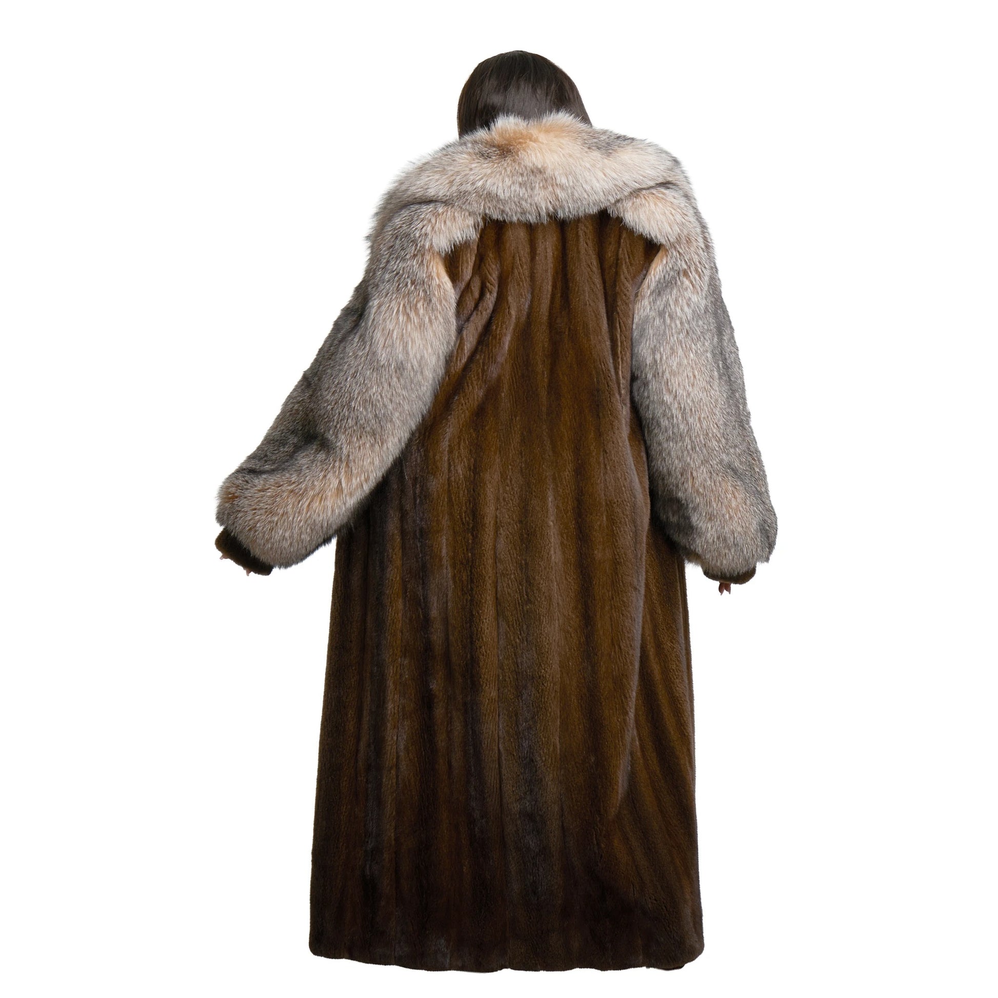 This full-length mink coat is designed with an opulent fox fur collar and front trim, creating a dramatic silhouette that embodies pure winter luxury. Crafted from premium mink, the body drapes with a smooth, elegant flow, while the voluminous fox fur framing adds dimension, warmth, and striking visual impact. The interior reveals rich, hand‑matched mink pelts that enhance movement and depth, making this piece a true statement of craftsmanship and sophistication.