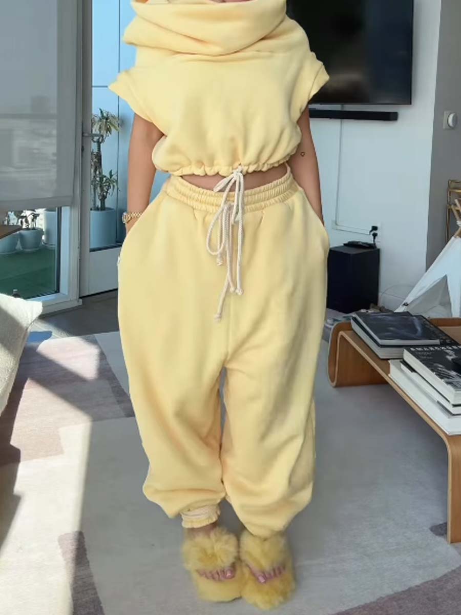 Cropped Sleeve Drawstring Hoodie Vest And Oversized Sweatpants Two Pieces Set