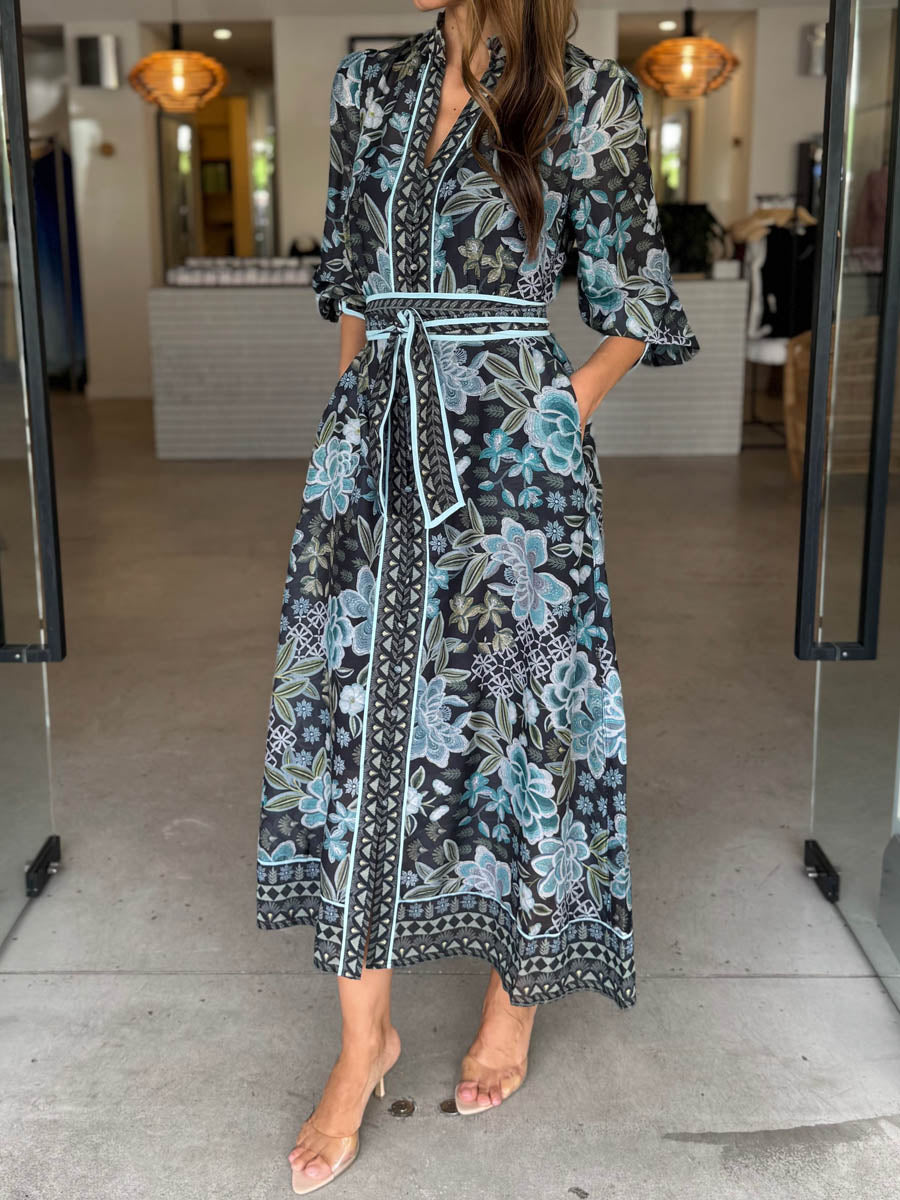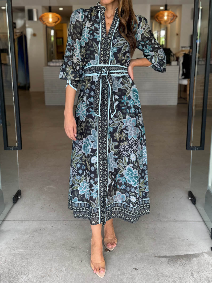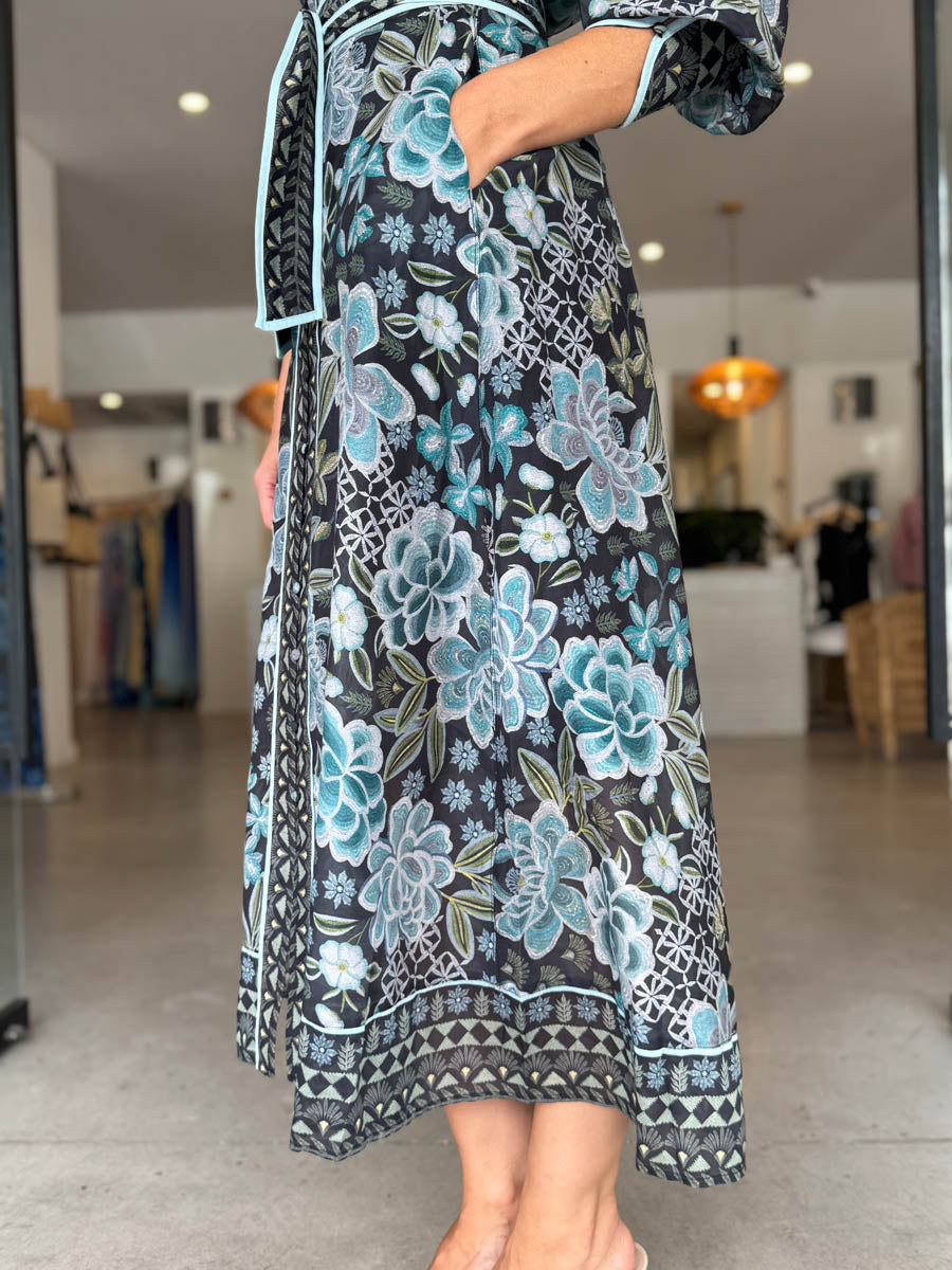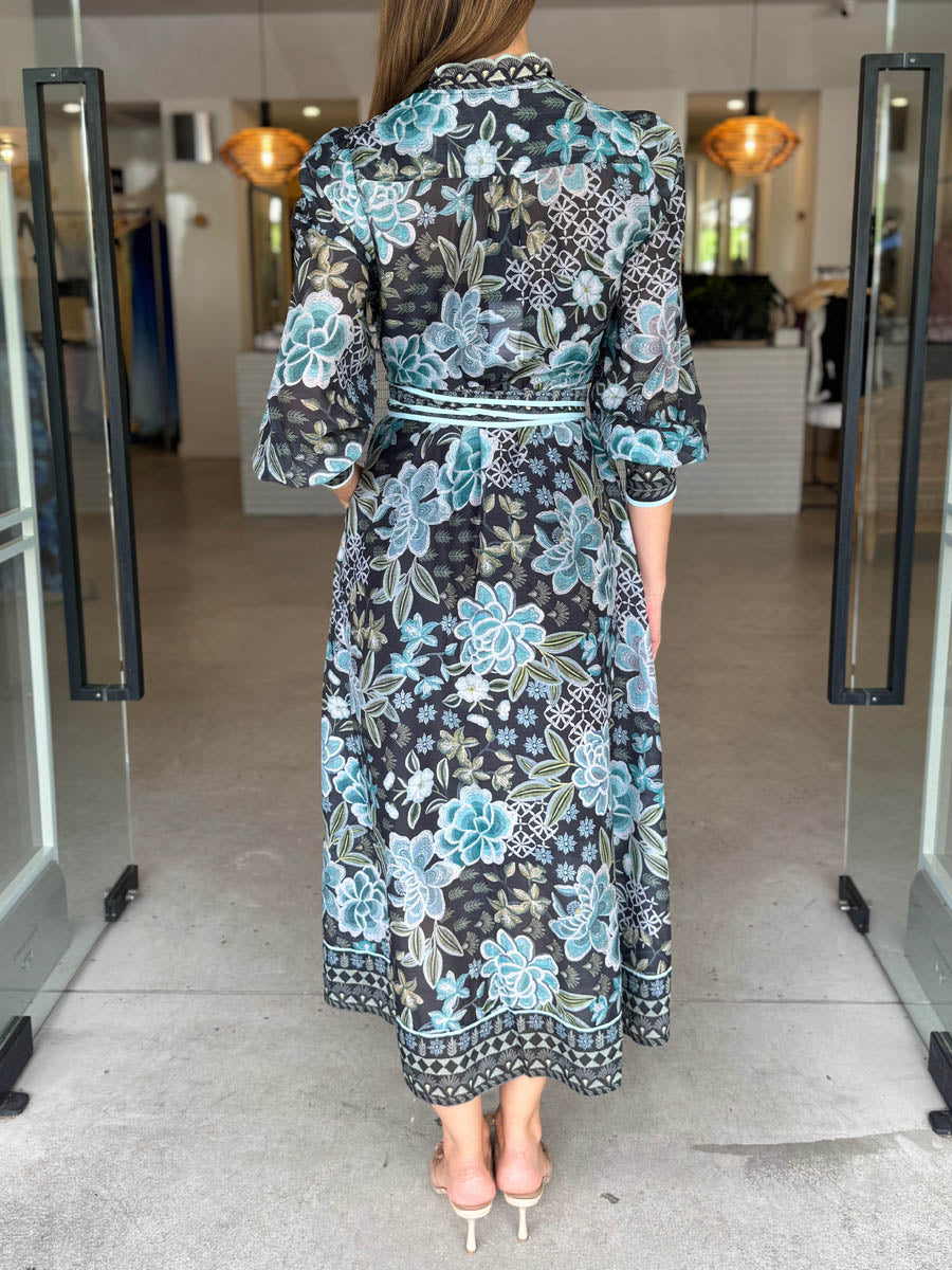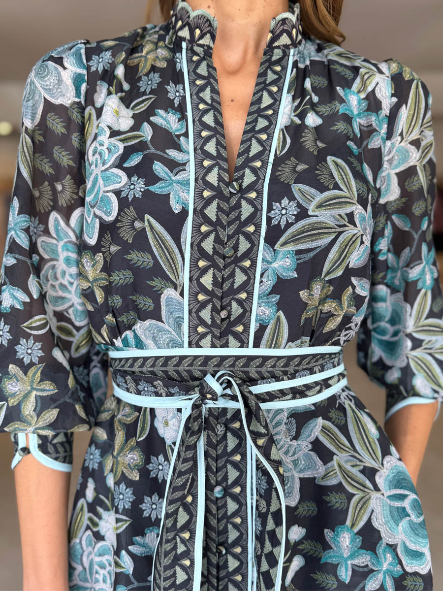 Experience the perfect blend of elegance and comfort with the Sienna Midi Dress in Dahlia Fields. This striking dress boasts a charming floral print in shades of teal, cream, and sage green, contrasted against a deep, dark background. Make a statement while maintaining effortless sophistication with its lightly tailored waistline, button down front, removable waist tie, and additional slip dress for coverage. Made from a luxurious cotton-silk blend, this dress is soft, lightweight, and breathable, ensuring all-day comfort.