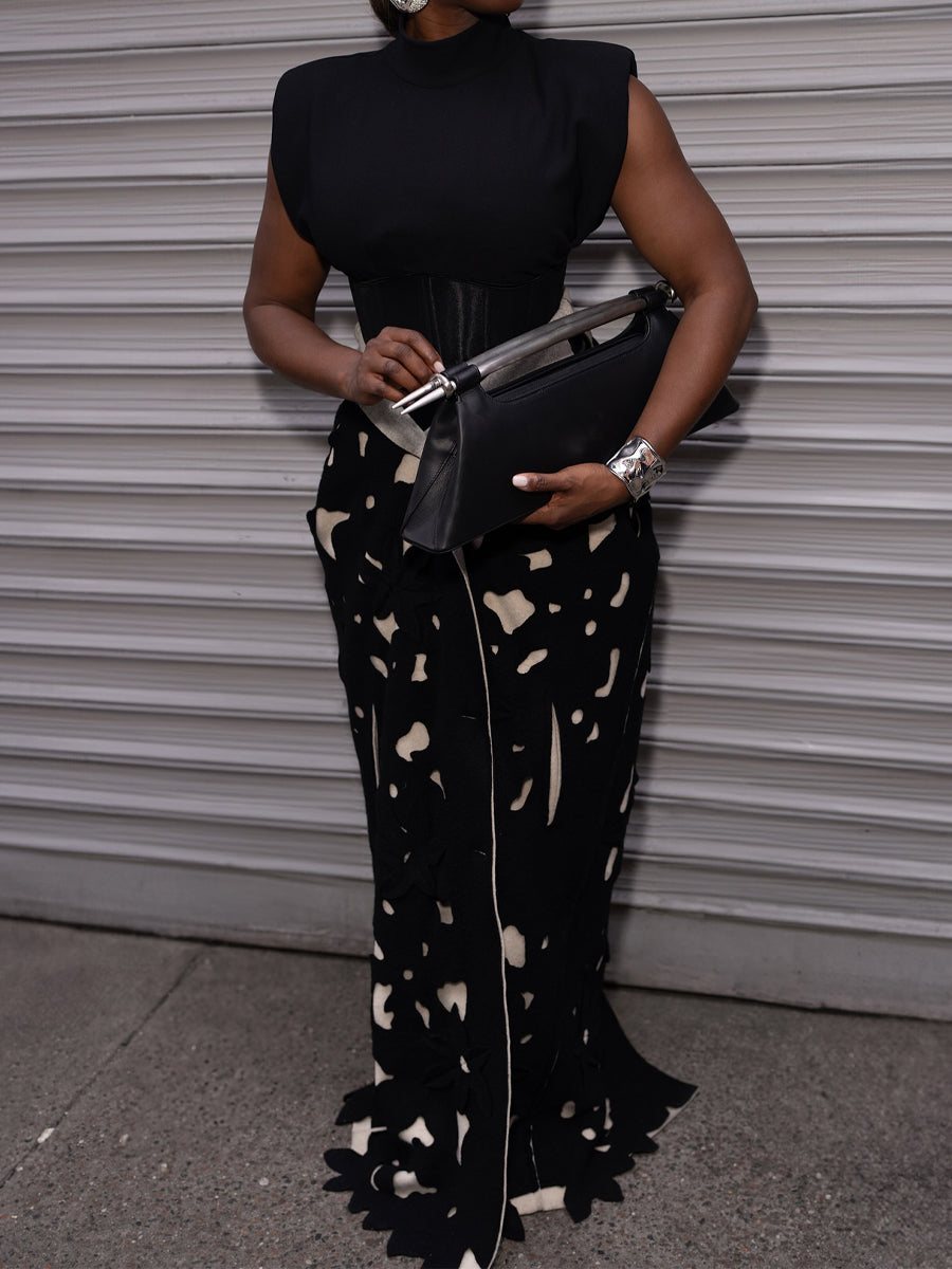 Single-breasted coat, felt, cutout, floral appliqués, two-tone, lapel collar, long sleeves, unlined, button fastenings, multipockets, dry clean, do not bleach, do not tumble dry