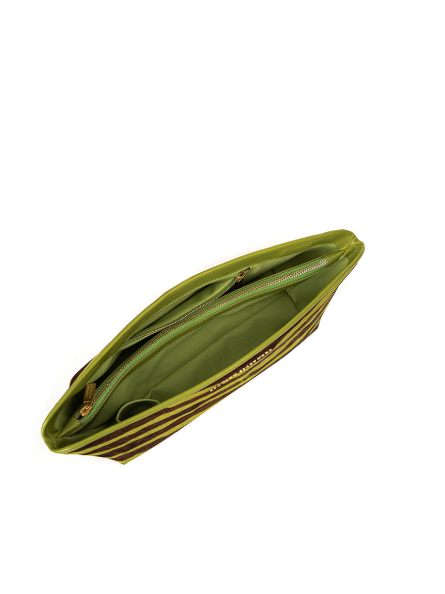 The Clutch brings a bold edge to evening dressing with its green zebra ponyhair finish. Luxe texture meets graphic pattern, creating a statement piece that feels both daring and refined. Compact yet impactful, it carries just the essentials while making an entrance of its own. A past-season favorite, the proves that a clutch can be as powerful as it is polished.
