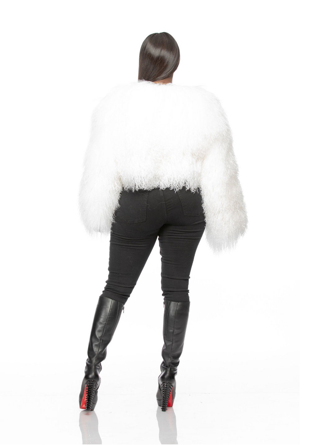 Be effortlessly fly in our gorgeous Cropped Mongolian Jacket. Wear her with your favorite jeans and boots to shine. This fur runs true to size. Model is 5'5'' 165lbs 36G bust and is wearing a size L for extra room.