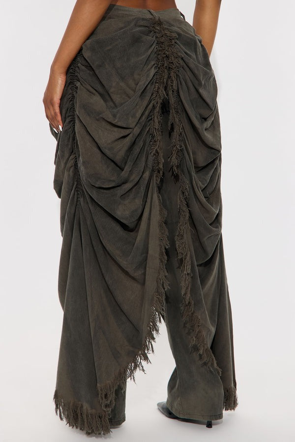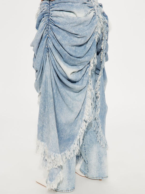 Make a bold entrance in the Denim Pant. These statement jeans are crafted from light-wash denim with acid wash detailing and feature a high-rise fit, functional belt loops, exaggerated ruched fabric overlay panels that drape down the legs, and ultra-raw fringe trim detailing.