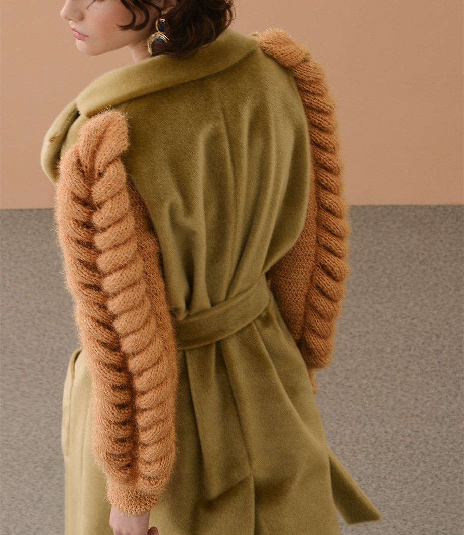 This coat features a plush olive green body with bold statement sleeves in a contrasting mustard yellow. The wide belt and oversized pockets add both style and function, making it a standout piece for cooler weather.
