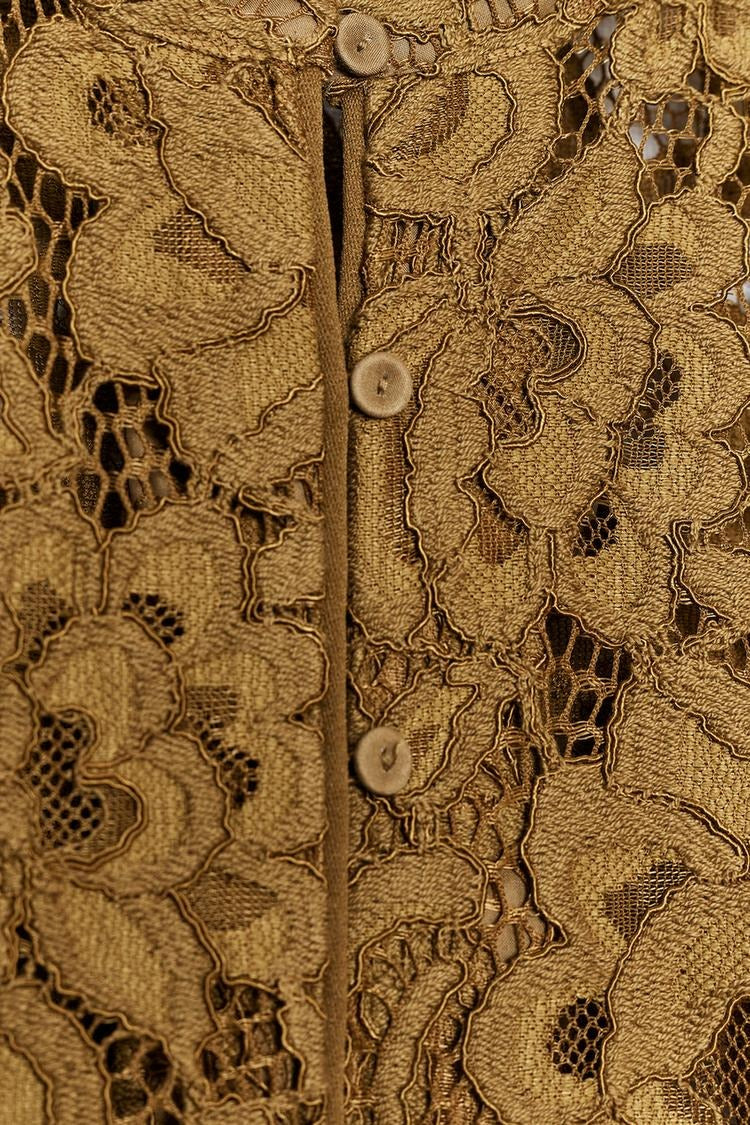 Jacket made of a lace-style fabric. Featuring a round neck and long puff sleeves. Front button fastening.