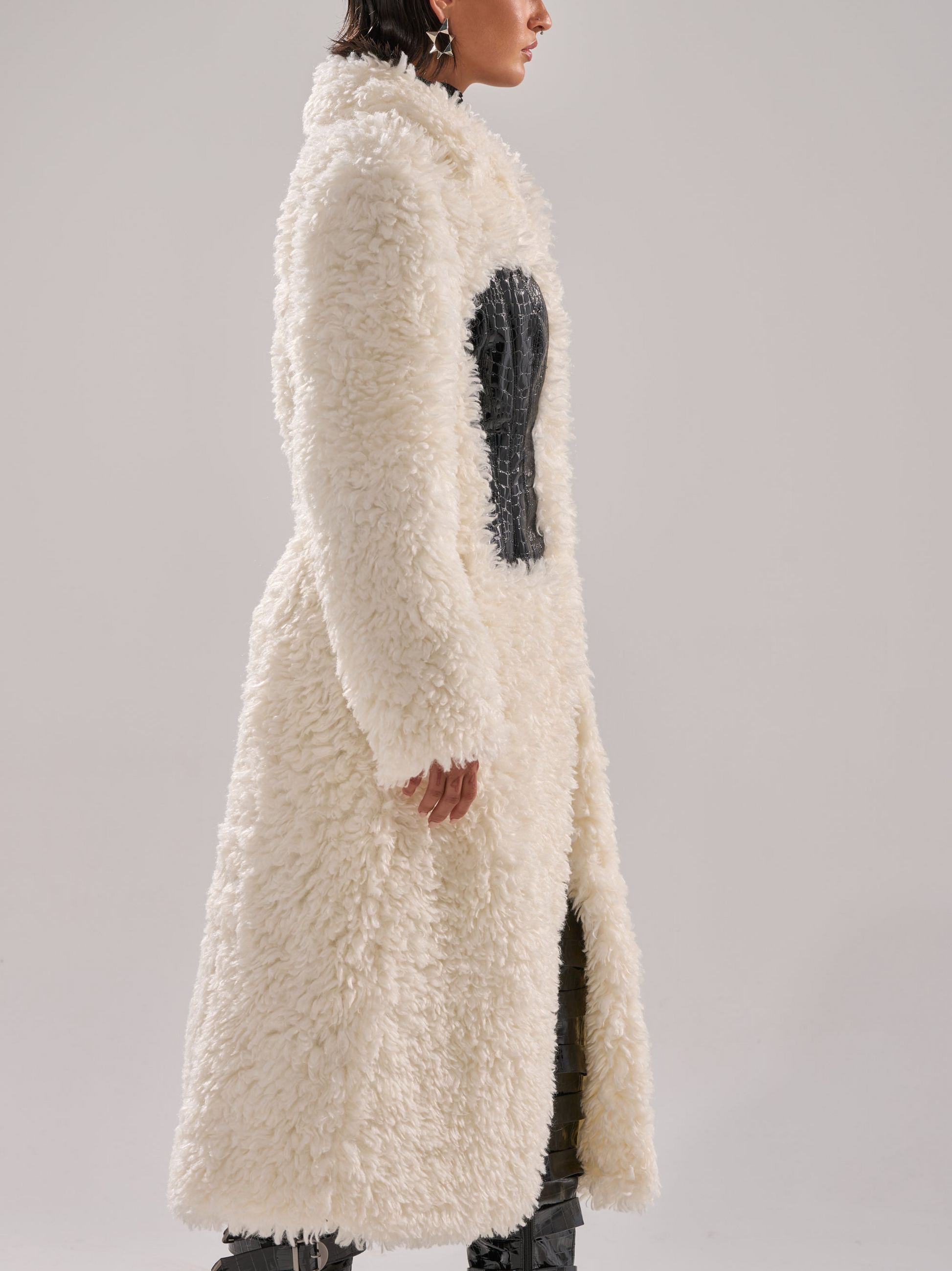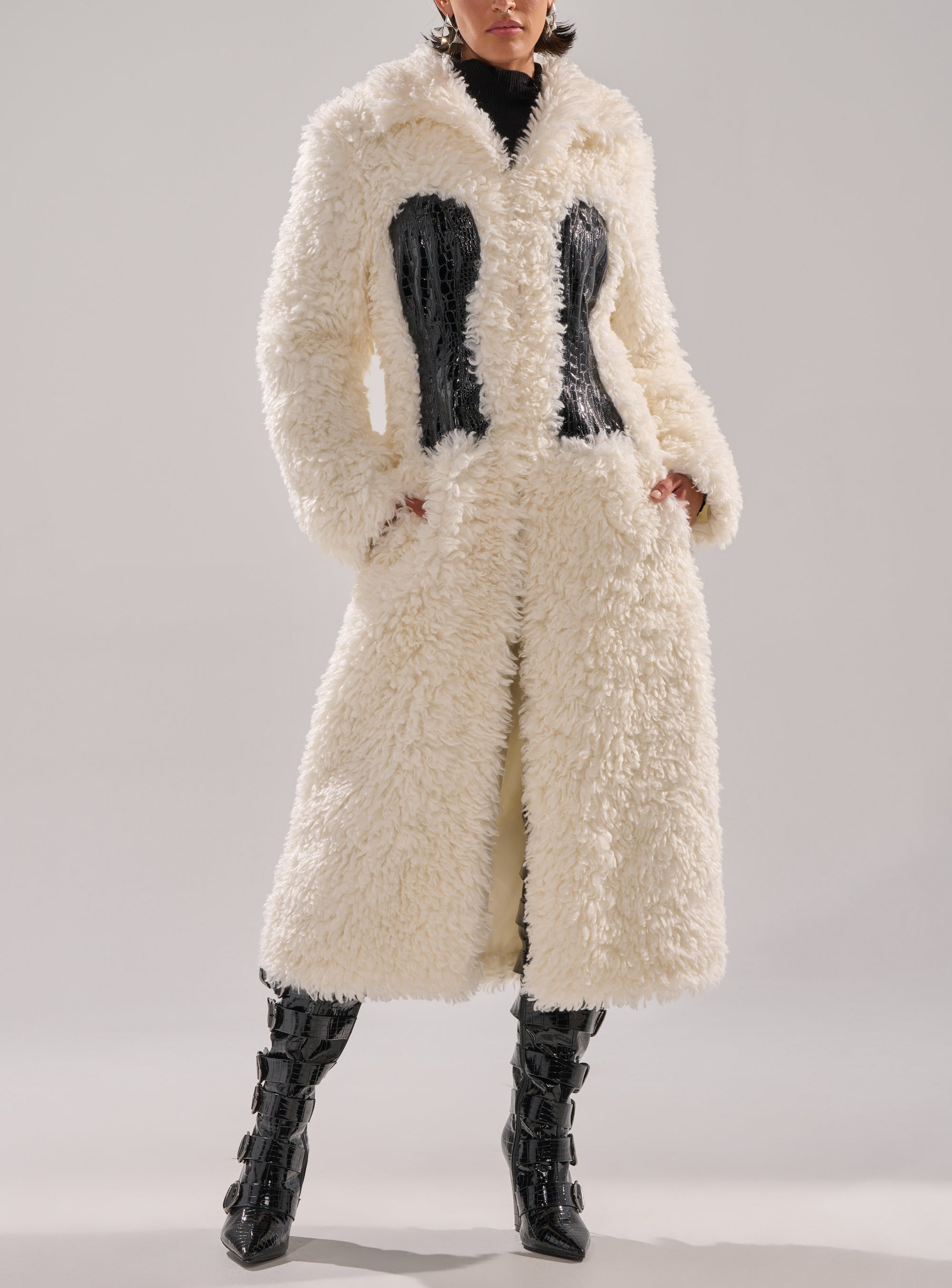 Forget flowers — girls want The Corseted Fur Coat. Crafted from luxuriously soft, chicly shaggy faux fur, this longline coat features a fold-over collar, long sleeves, spacious side seam pockets, slick interior lining, and concealed hook and eye front fastenings. Corset-inspired paneling crafted from glossy, faux crocodile leather stretches from bust to waist for an unexpected dash of flair.