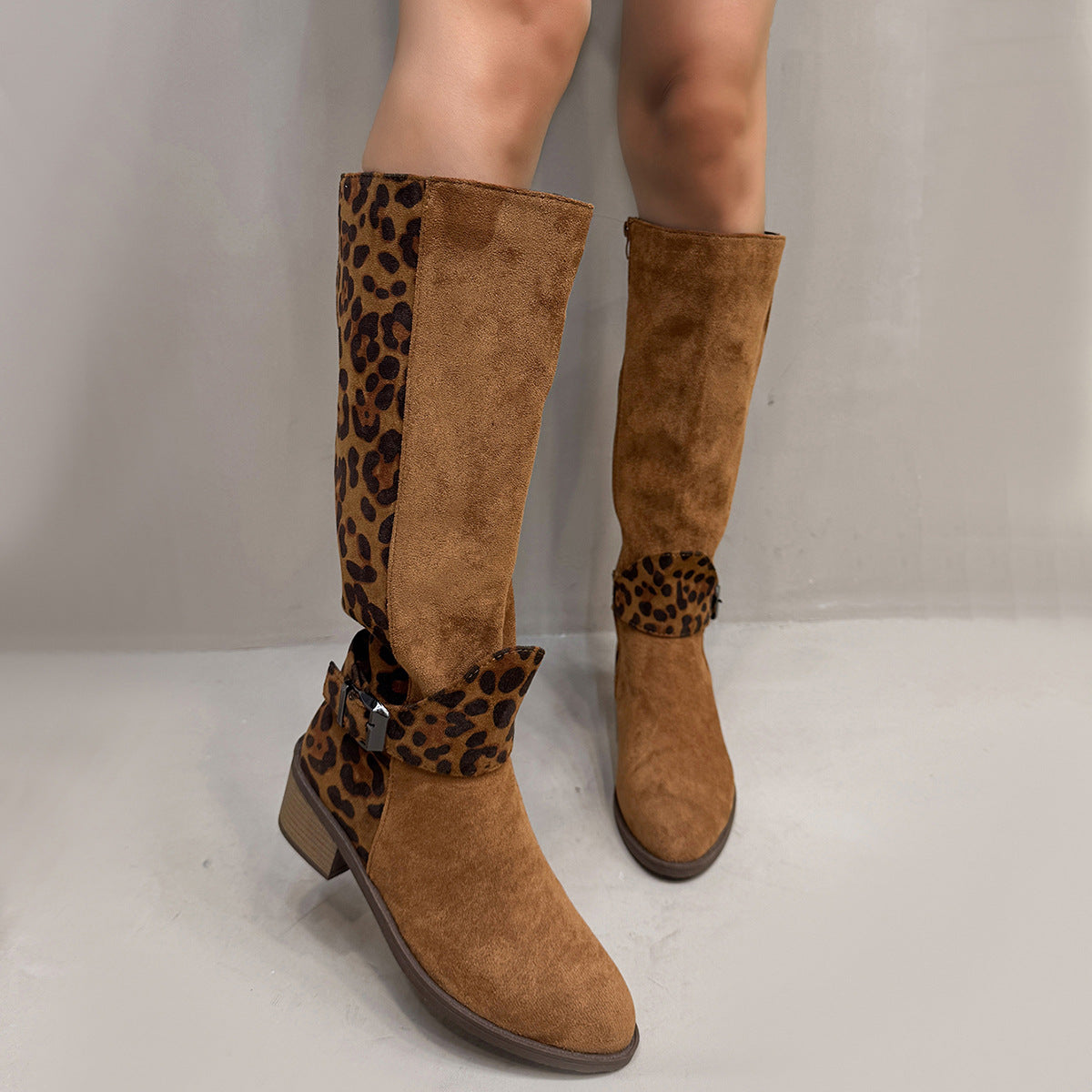 Leopard Print Buckled Design Chunky Heel Roomy Knee Boot