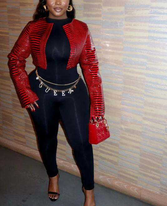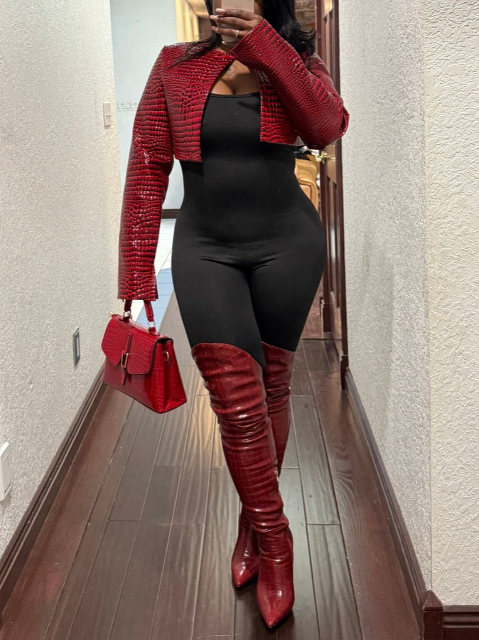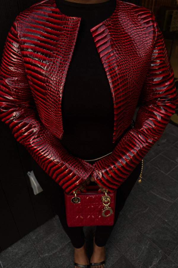Exude power and sophistication with the Croc Jacket, a bold statement piece for the daring fashionista. Crafted in a striking deep red faux-crocodile vegan leather, this open-front jacket combines luxury with edge. Its structured design adds a sleek silhouette, perfect for elevating any outfit. The Croc Jacket ensures you stand out with confidence and unparalleled style.