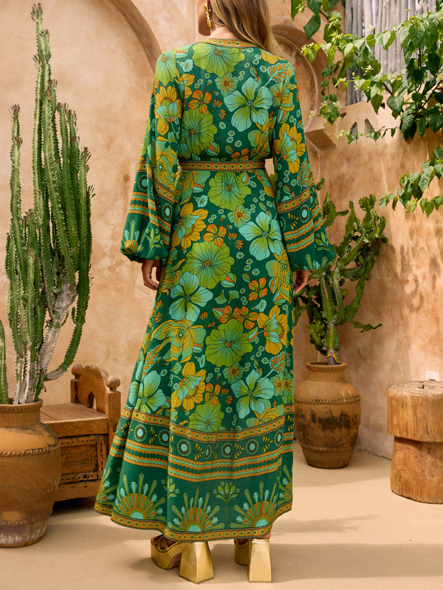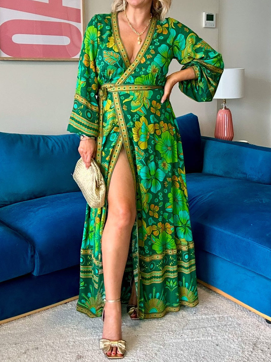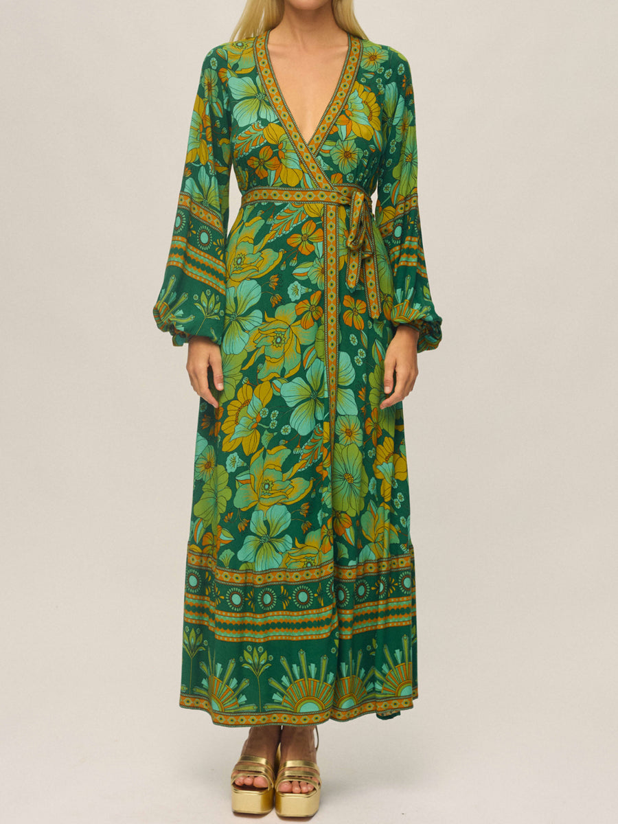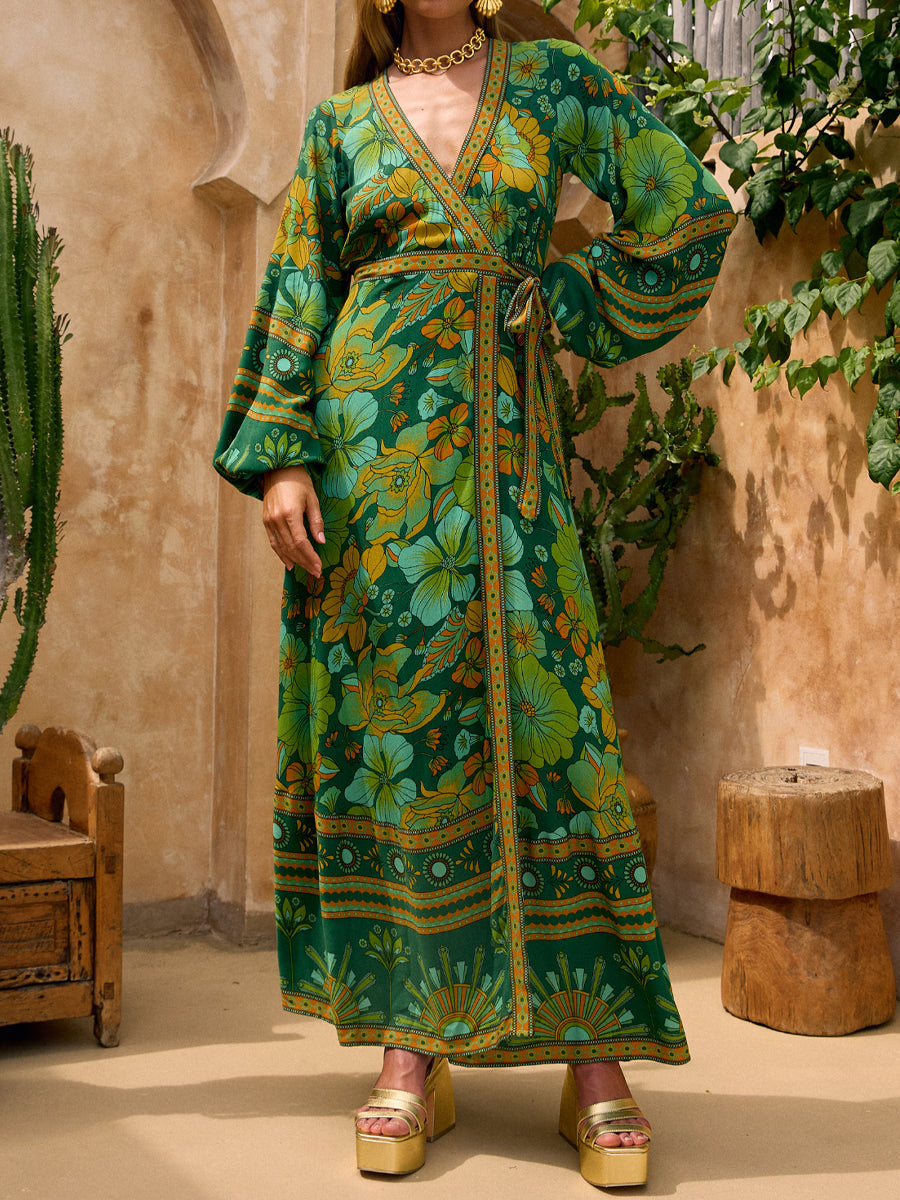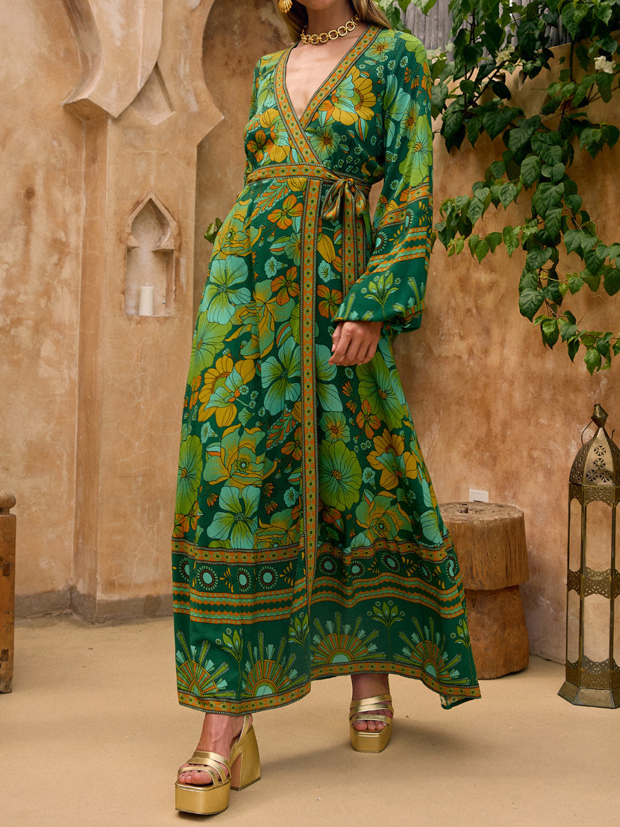 Printed V Neck Wrapped Maxi Dress