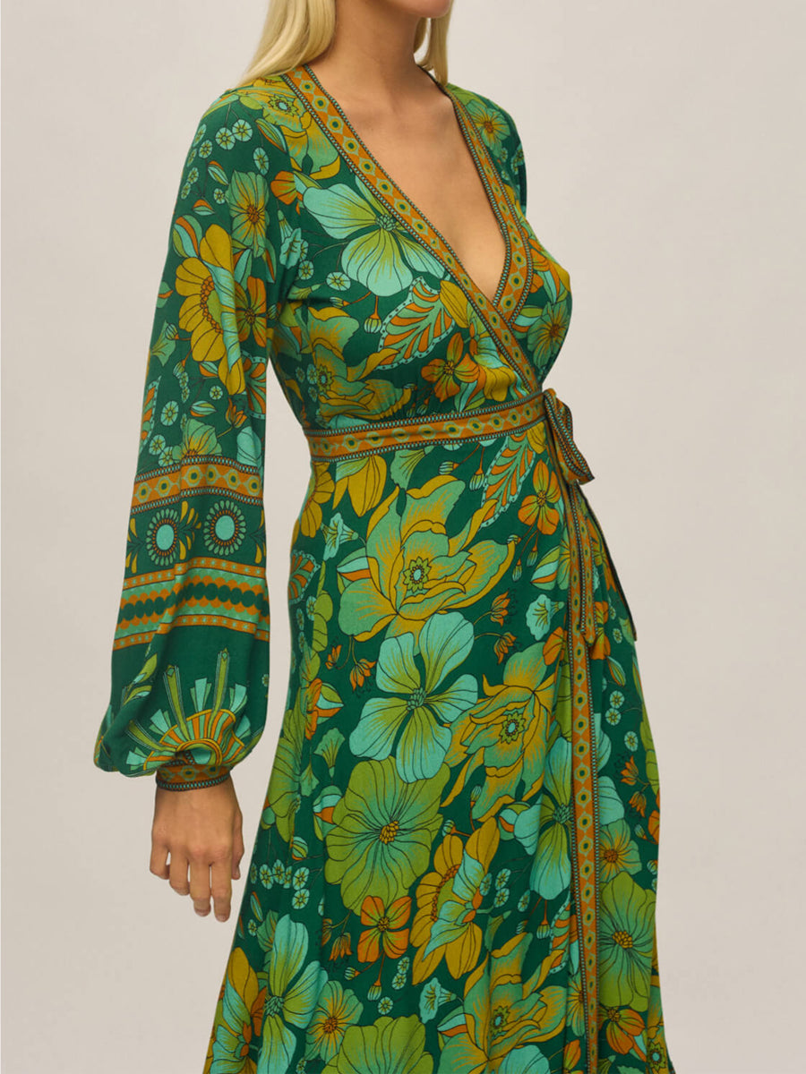 Feel all kinds of glamorous with our Maxi Dress. Designed in our most adored colourway, emerald, this dress features statement poet sleeves, a sophisticated wrap silhouette and incredibly detailed print placement throughout. Draped in our much loved Crepe - the Maxi is the perfect piece to make an impact at that special occasion.