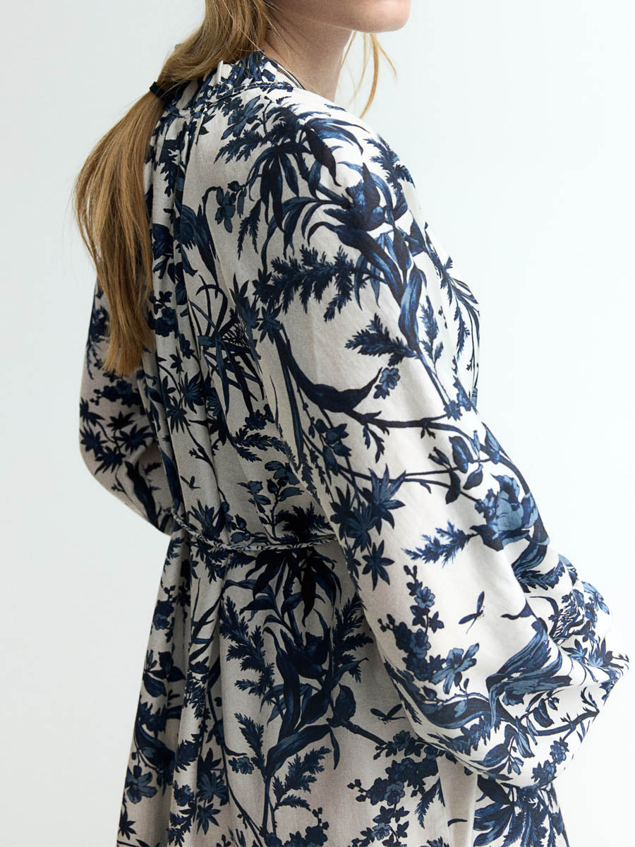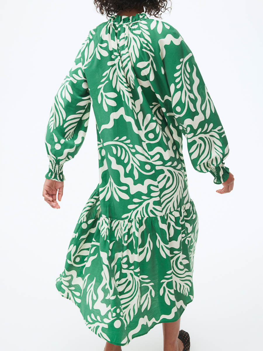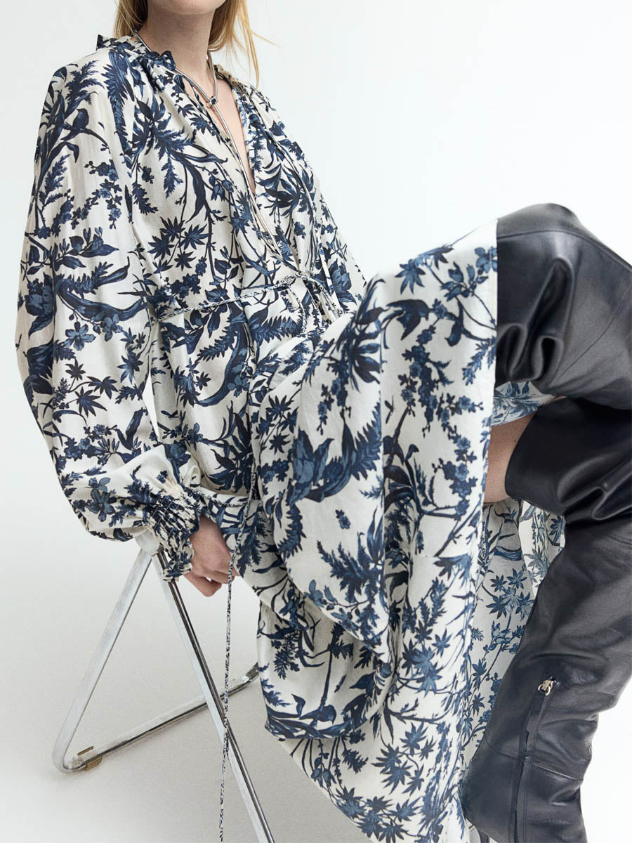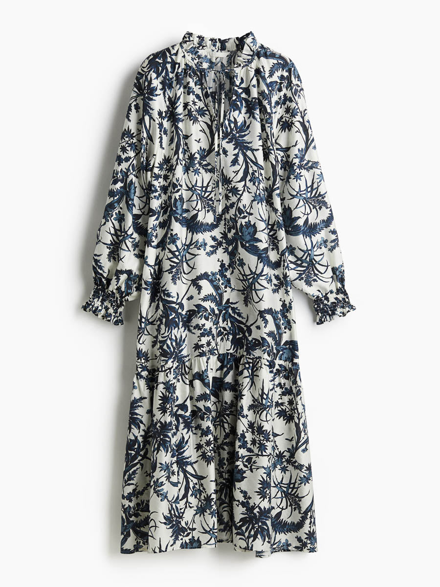 Loose-fit dress in woven fabric. Ruffled stand-up collar, V-shaped opening at front with extra-narrow ties, long raglan balloon sleeves, and smocked, ruffle-trimmed cuffs. Gathered seam above knees for added volume. Unlined.