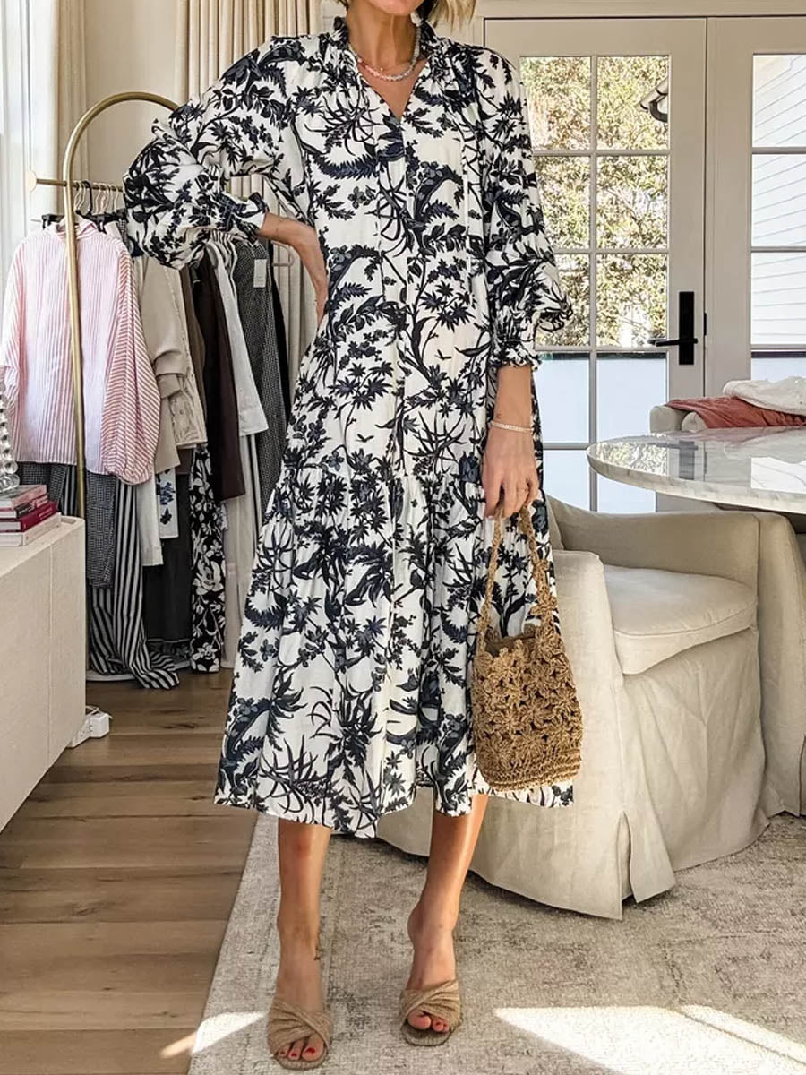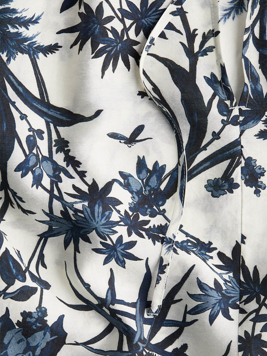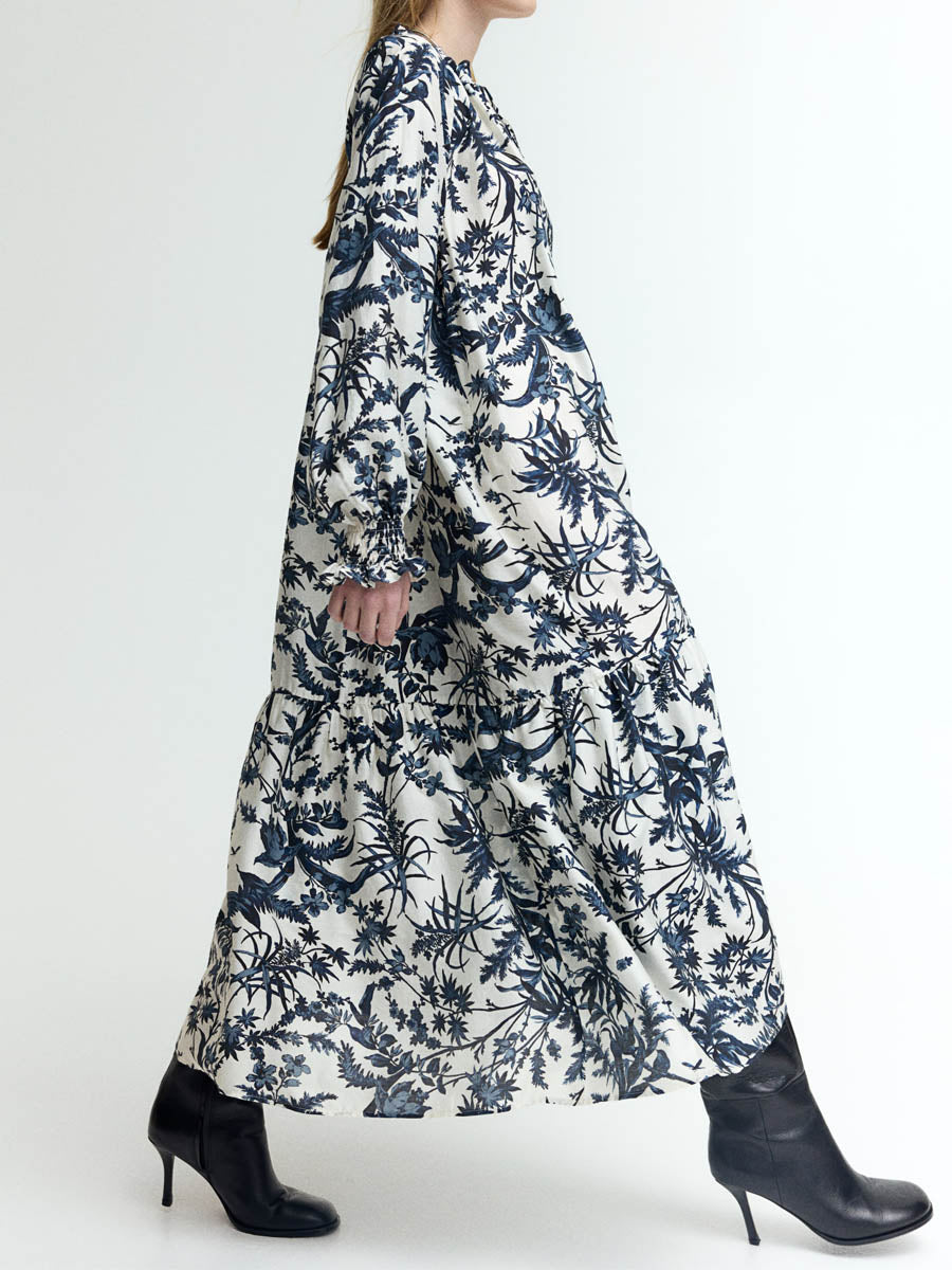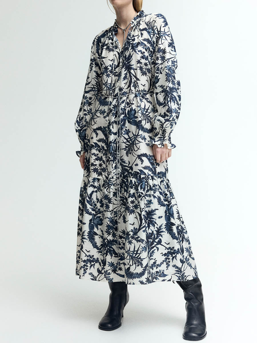 Loose-fit dress in woven fabric. Ruffled stand-up collar, V-shaped opening at front with extra-narrow ties, long raglan balloon sleeves, and smocked, ruffle-trimmed cuffs. Gathered seam above knees for added volume. Unlined.