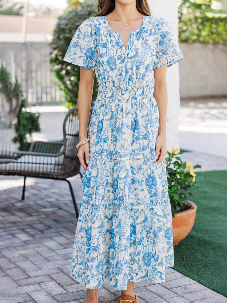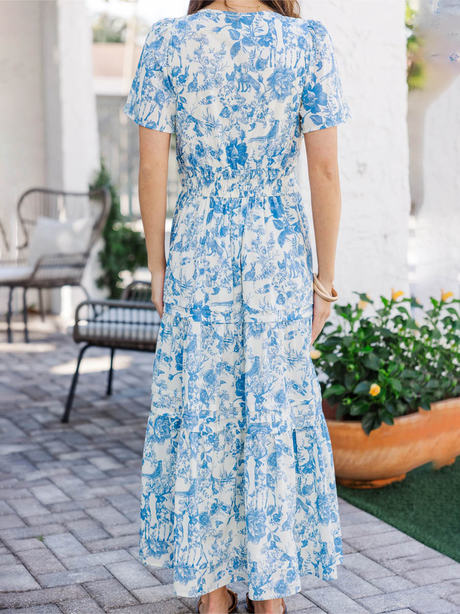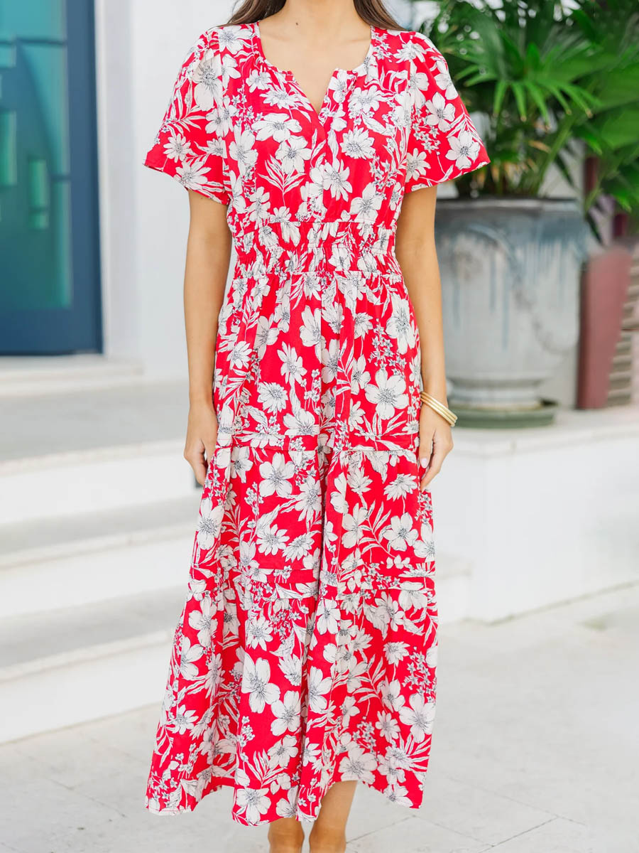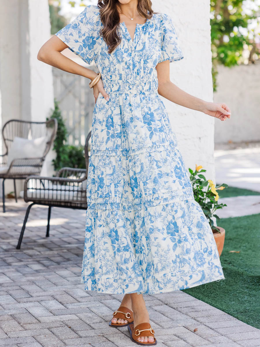 Split V-neck Smocked Waist Printed Tiered Midi Dress